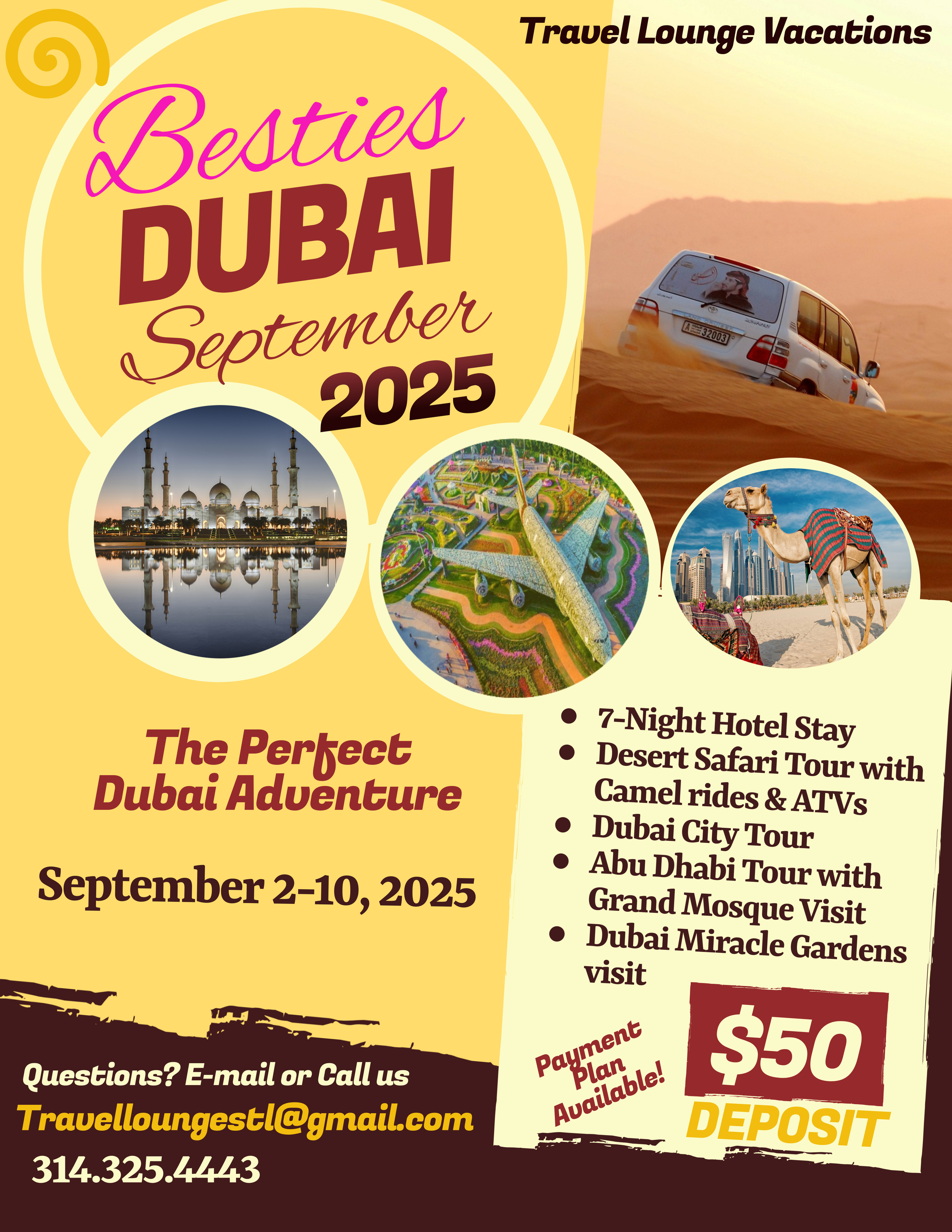 Email us at Travelloungestl@gmail.com or call 314-325-4443