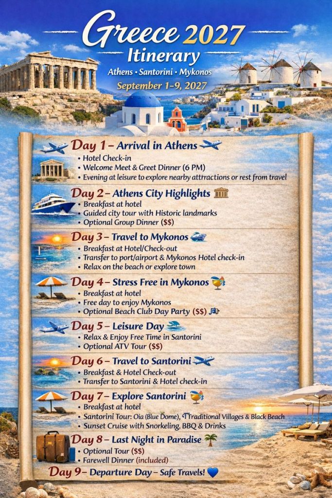 Greece 2027: Athens • Mykonos • Santorini