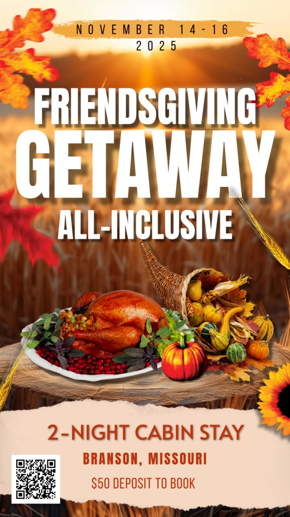 - DAY 2: Brunch at 11:30 AM; Wine & Charcuterie; 2:00 PM Optional Branson Outing; 7:00 PM Friendsgiving Dinner & Party